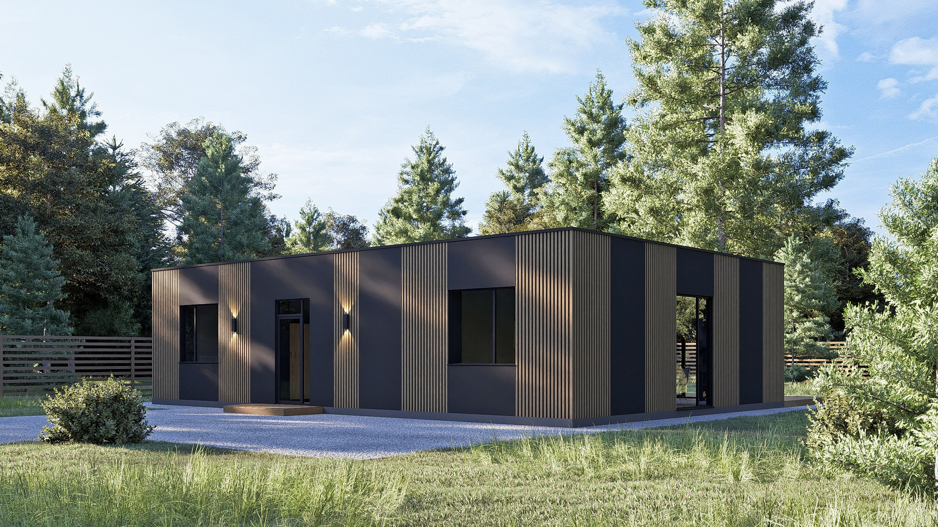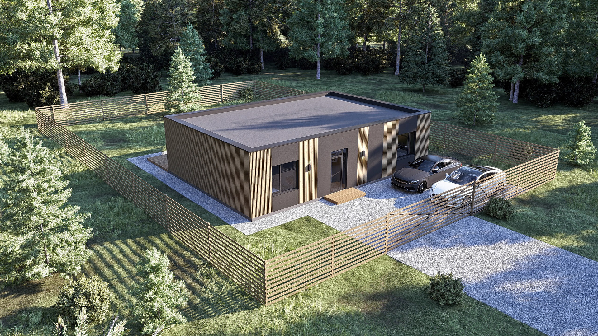 Высокотехнологичный внешний вид дома дополнен выразительной плоской крышей, подчеркивающей современность стиля и уважение к окружающей среде.