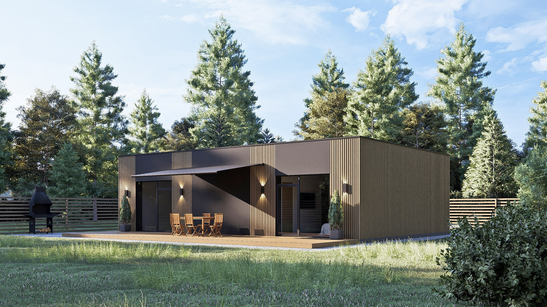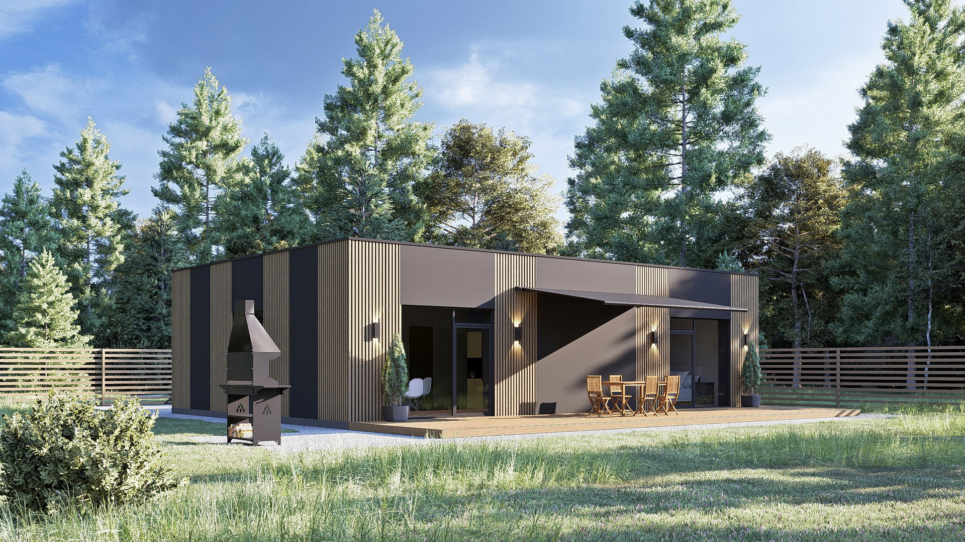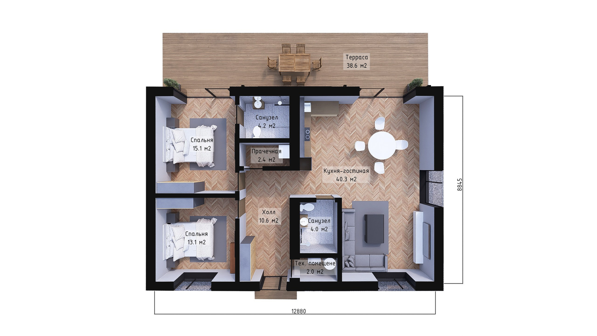 Практически симметричные пропорции здания (длина — 12, 88 м, ширина — 8, 84 м) создают эффект гармонии и визуальной привлекательности. Подобные размеры подходят практически любому участку земли, гарантируя максимальную эффективность размещения и возможность наслаждаться окружающим ландшафтом.