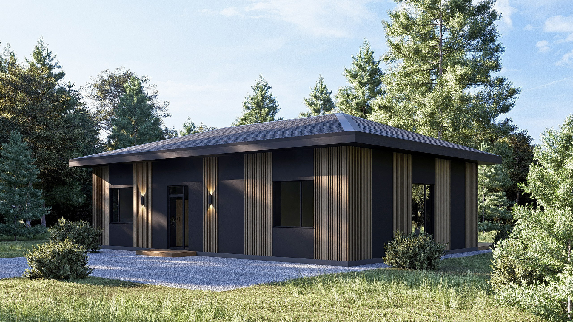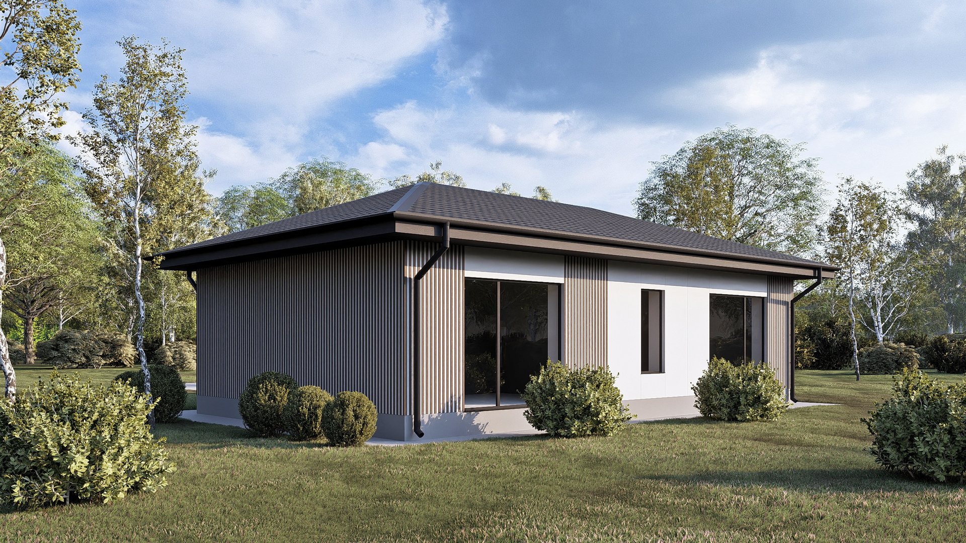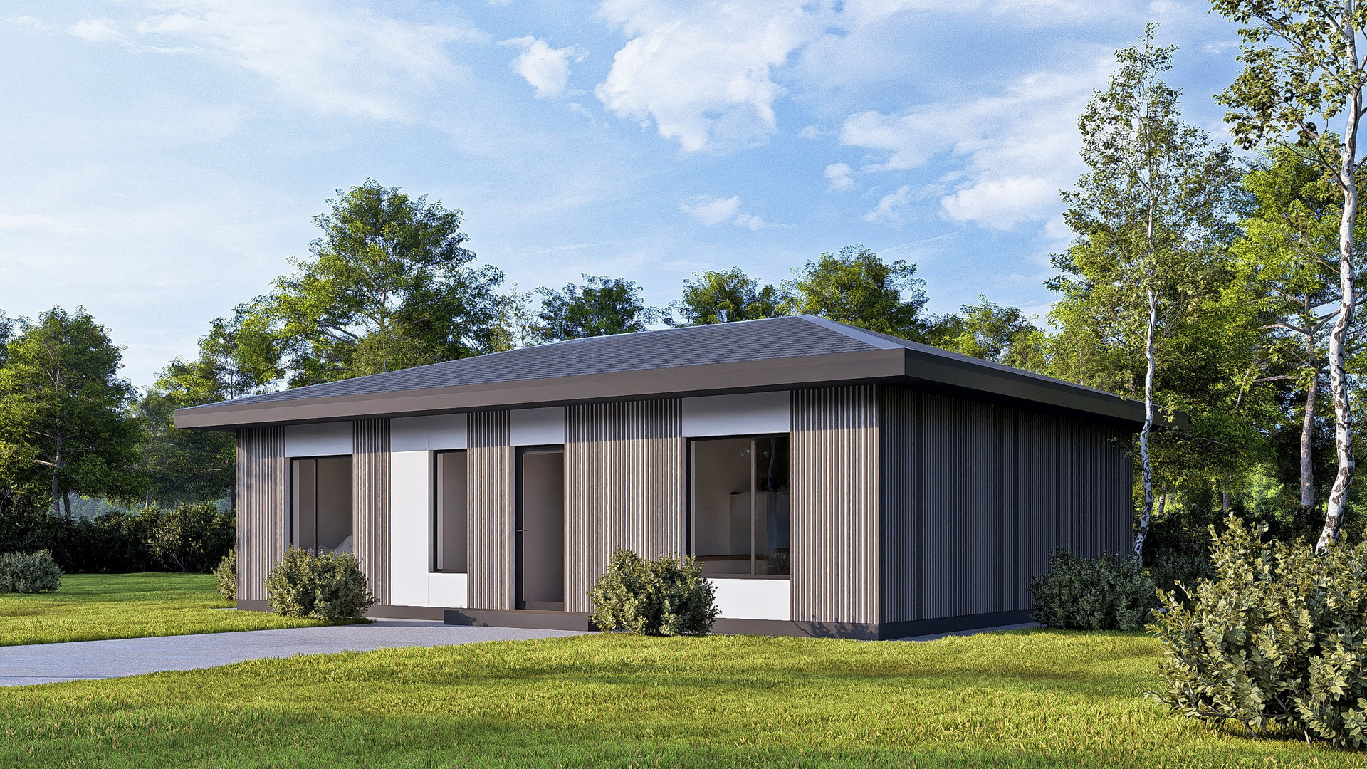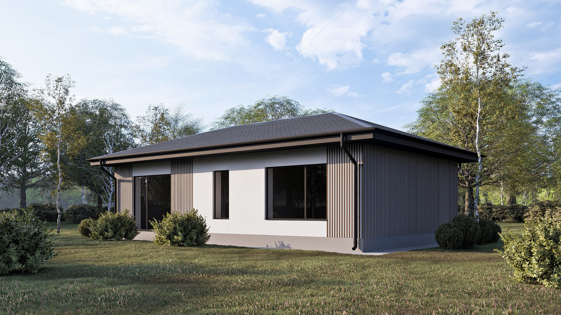 Приятные пастельные тона и натуральные материалы придают дому легкий и приятный внешний вид, который прекрасно интегрируется в естественный ландшафт. Габаритные размеры 12, 88 м x 7, 23 м идеально подойдут большинству участков, оставляя достаточно места для сада или зоны отдыха.