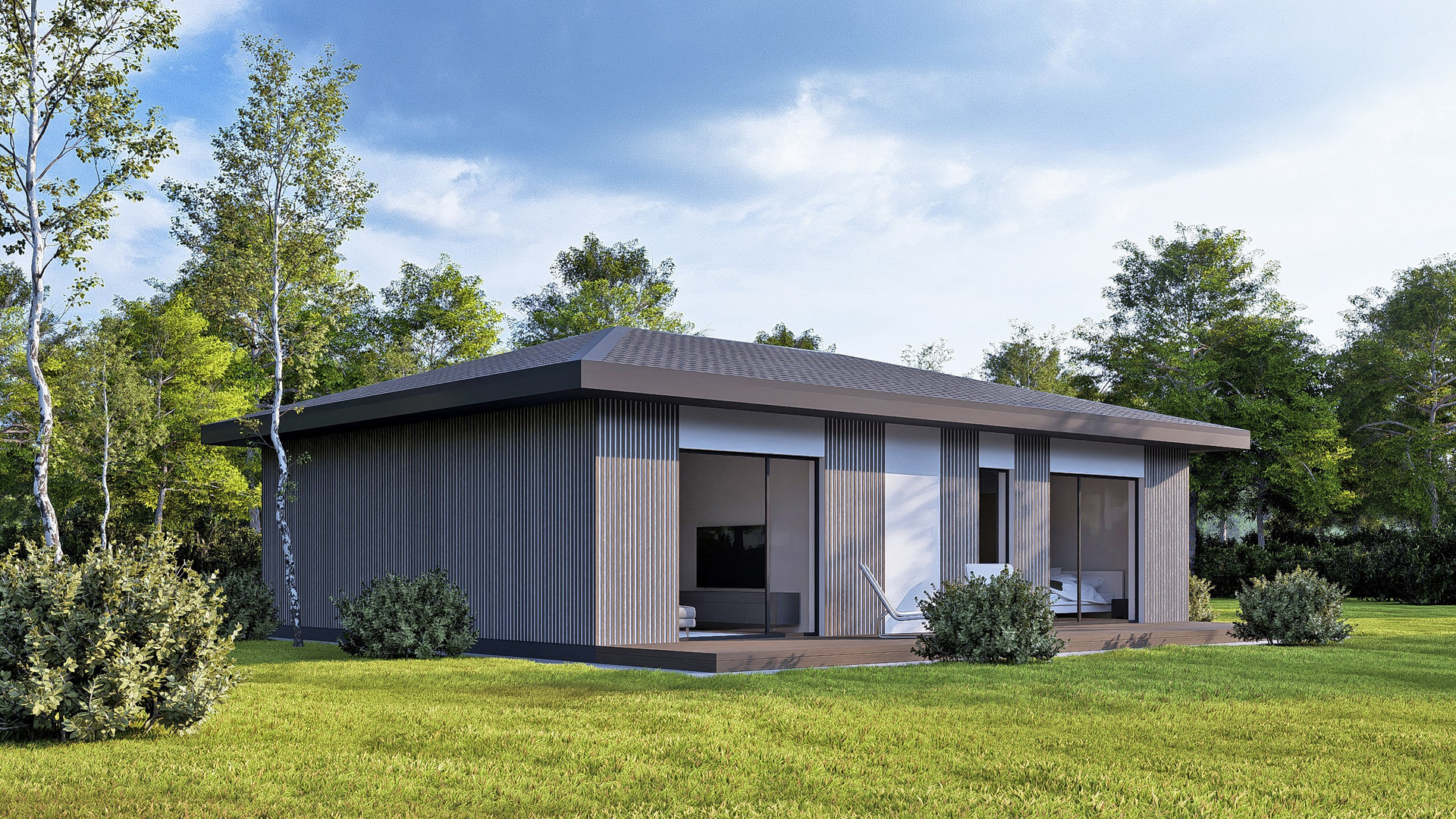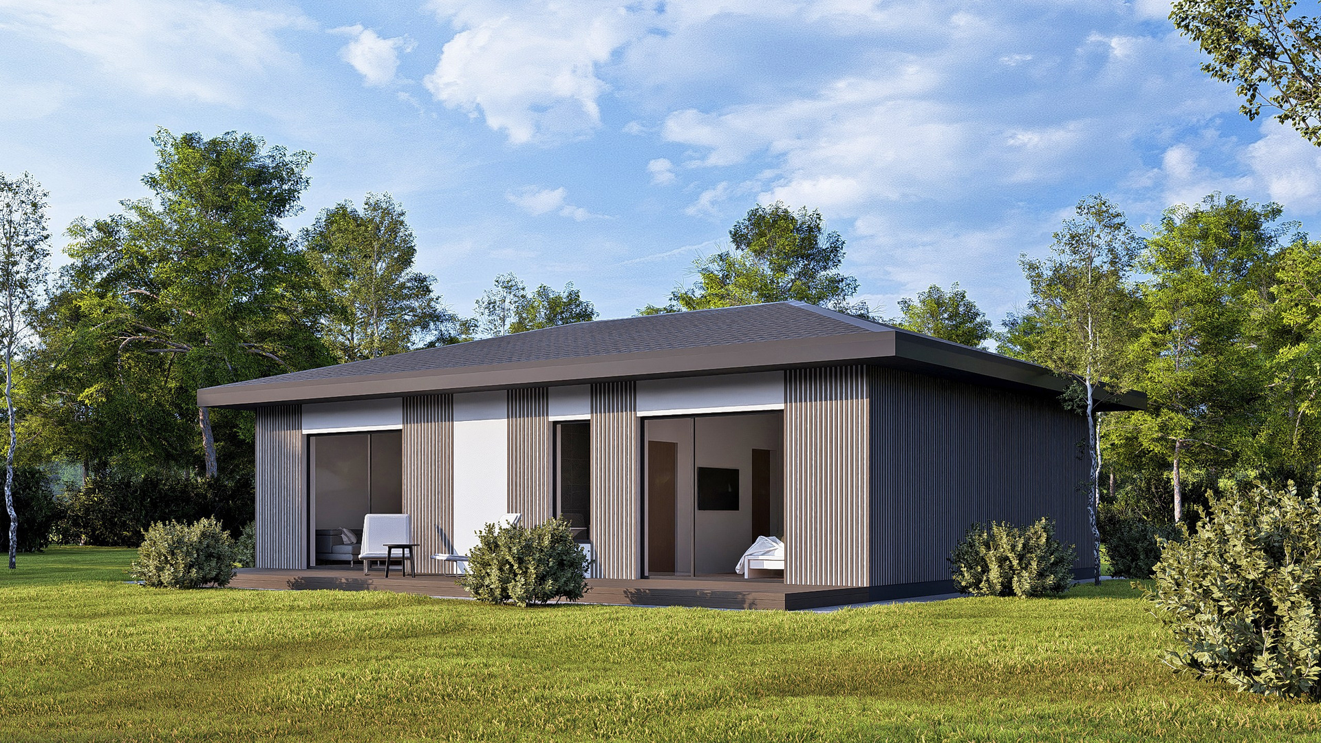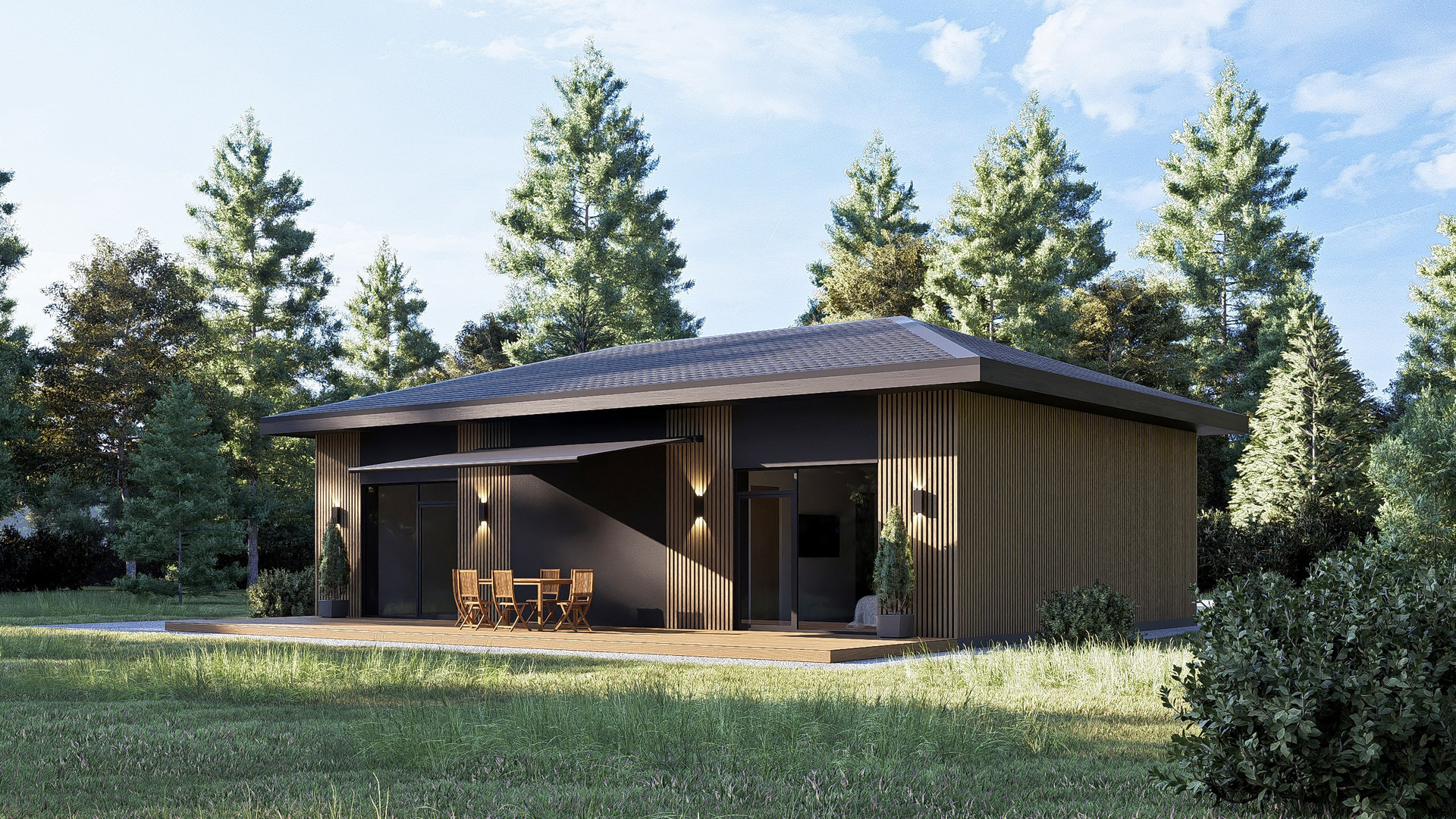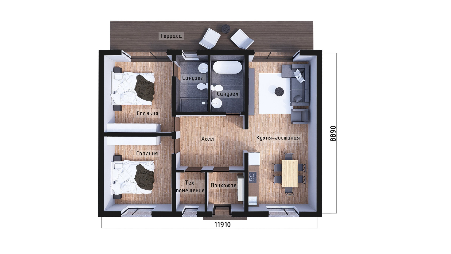 Приятные пастельные тона и натуральные материалы придают дому легкий и приятный внешний вид, который прекрасно интегрируется в естественный ландшафт. Габаритные размеры 12, 88 м x 7, 23 м идеально подойдут большинству участков, оставляя достаточно места для сада или зоны отдыха.