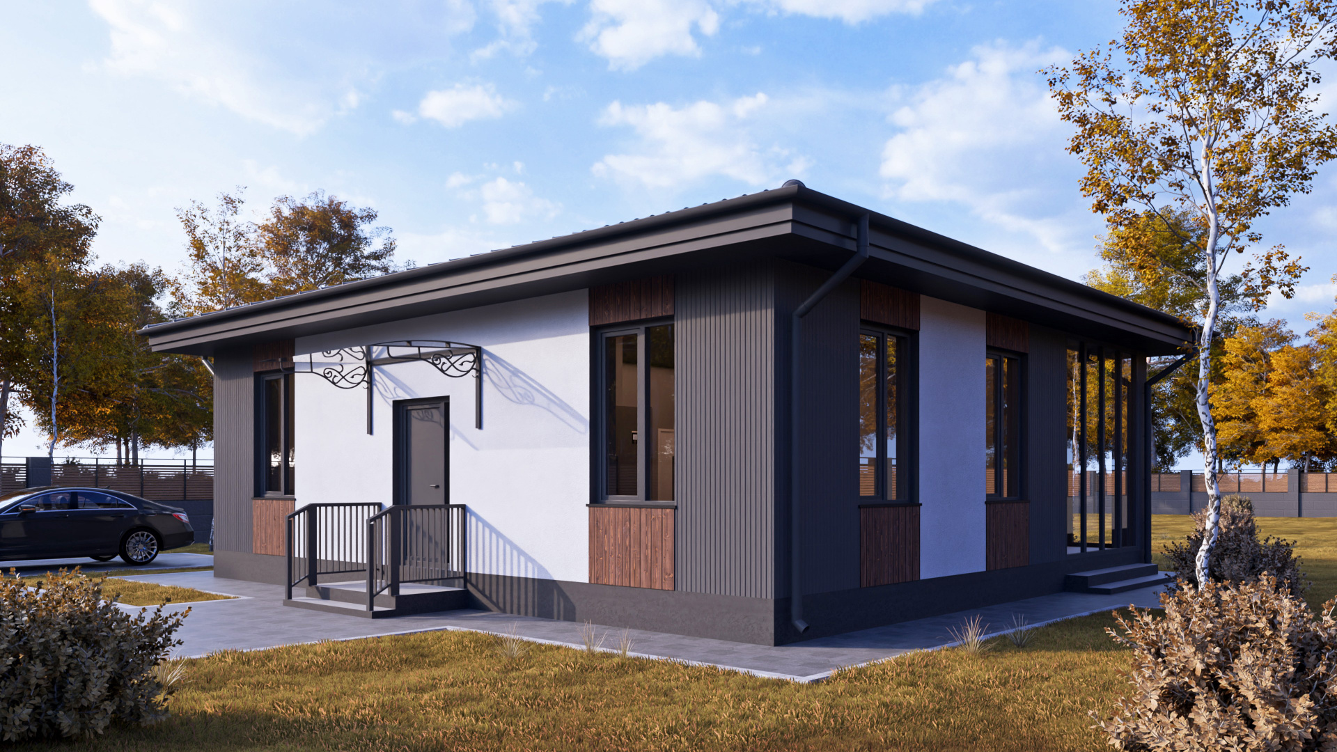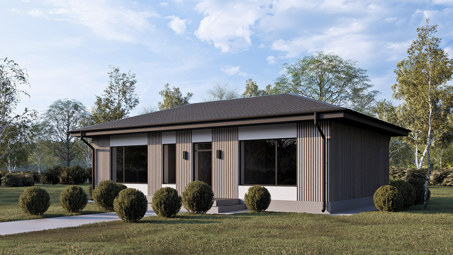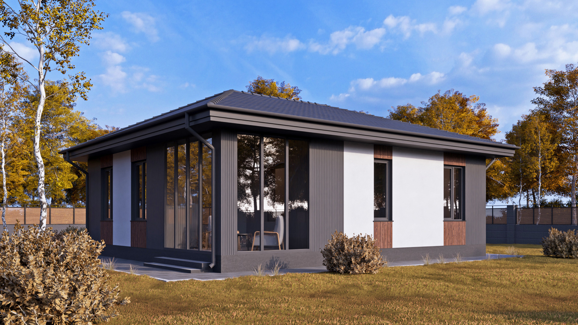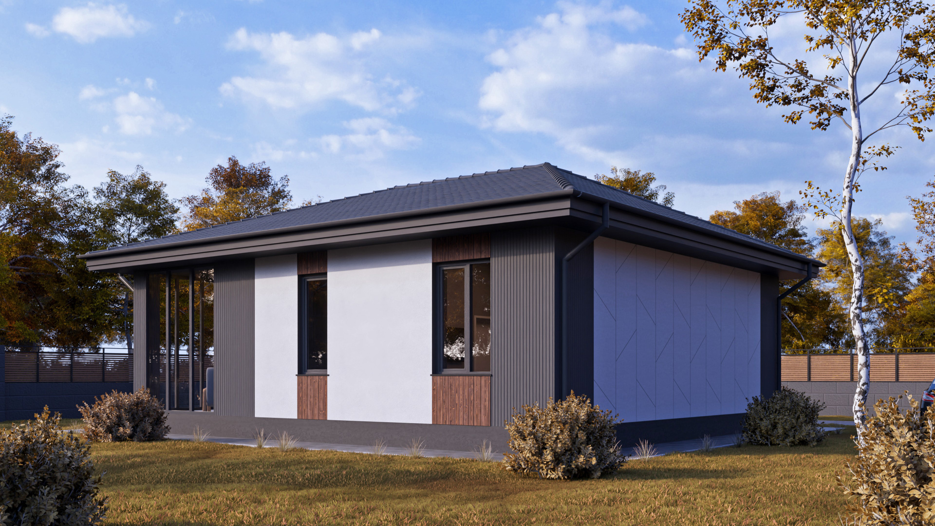 Приятные пастельные тона и натуральные материалы придают дому легкий и приятный внешний вид, который прекрасно интегрируется в естественный ландшафт. Габаритные размеры 12 м x 7,2 м идеально подойдут большинству участков, оставляя достаточно места для сада или зоны отдыха.