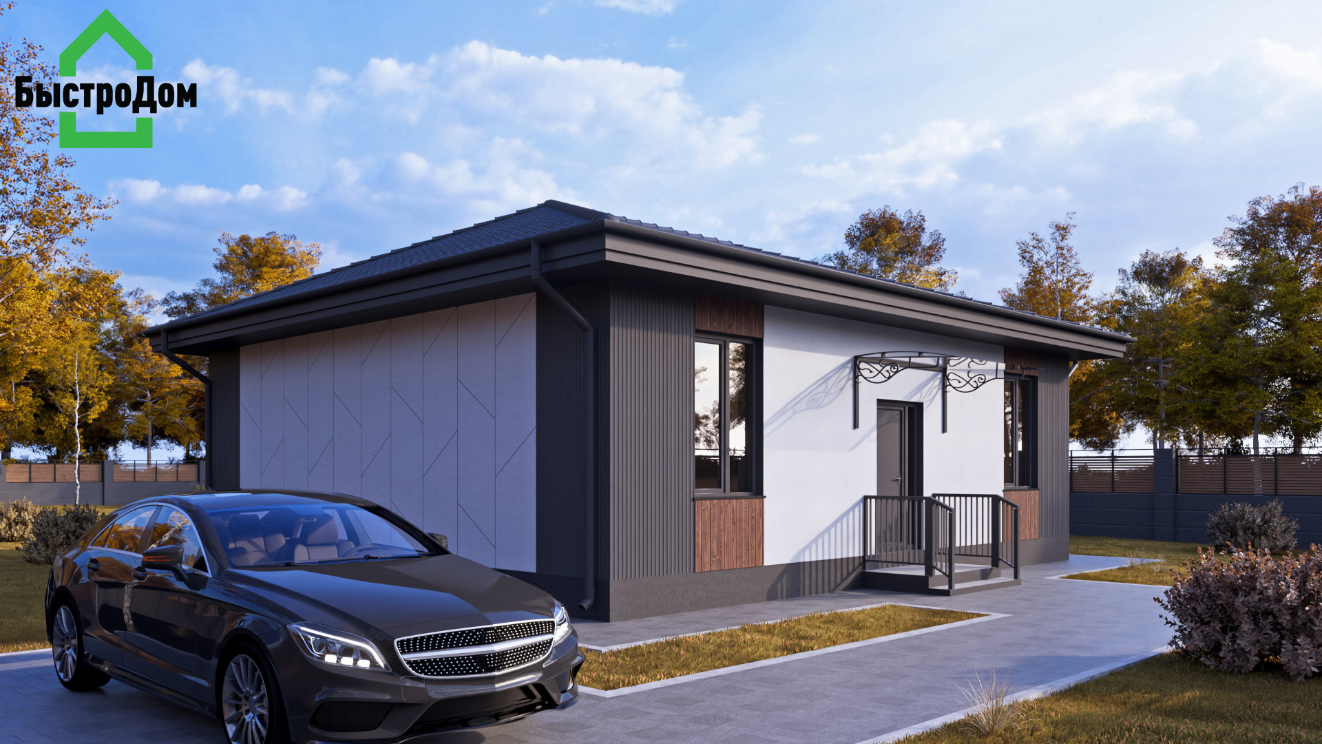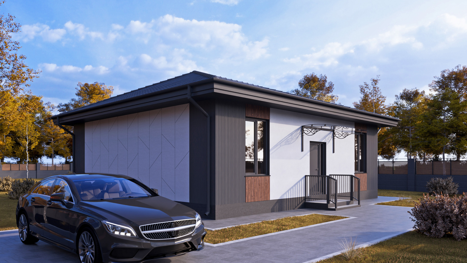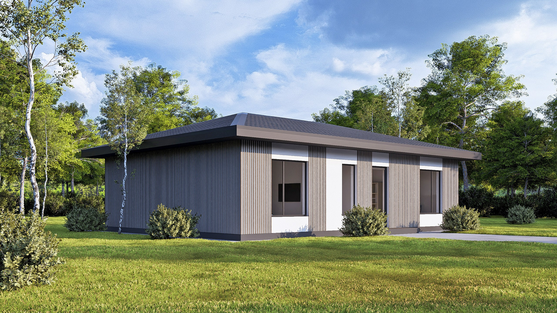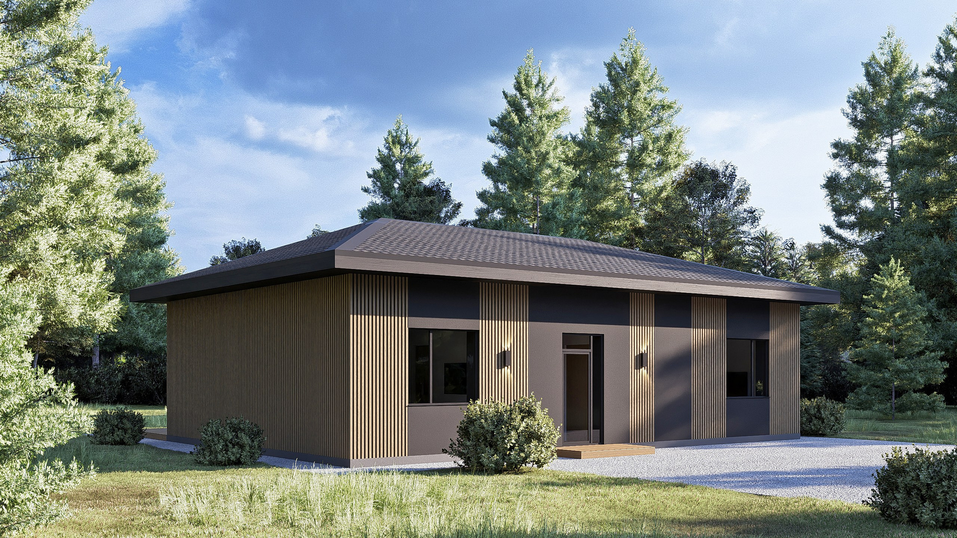 Приятные пастельные тона и натуральные материалы придают дому легкий и приятный внешний вид, который прекрасно интегрируется в естественный ландшафт. Габаритные размеры 12 м x 7,2 м идеально подойдут большинству участков, оставляя достаточно места для сада или зоны отдыха.